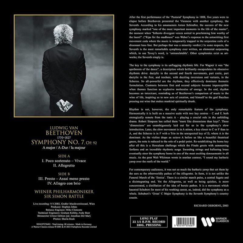 貝多芬的九大交響曲被認為是有史以來最偉大的音樂文化遺產之一,並且是每一位指揮家都必鑽研的主要曲目。2002年4月29日至5月17日,指揮家賽門‧拉圖爵士與維也納愛樂在維也納愛樂歷史悠久的金色大廳,為EMI廠牌以現場音樂會的形式錄製了貝多芬的九大交響曲。而這首第7號交響曲則是這個錄音計畫中的亮點之一,並獲得法國金音叉獎。
