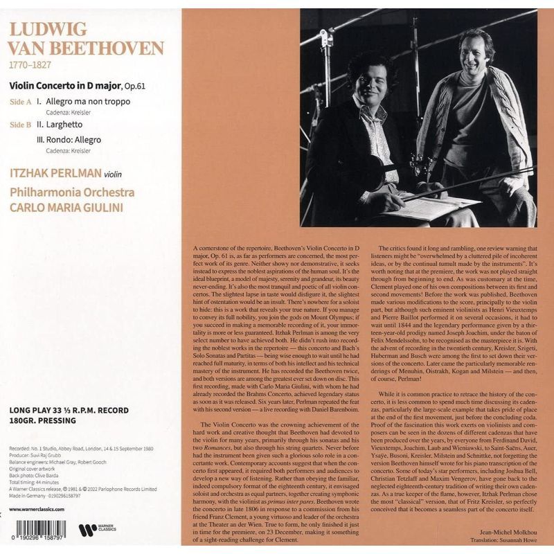 1980年,卅五歲的帕爾曼留下這張不朽的貝多芬經典紀錄,在此之前,他已經將音樂史上重要的小提琴協奏曲都錄過一輪了,可見此曲在帕爾曼心目中的地位。在此之前,帕爾曼與指揮大師朱里尼已經合作過布拉姆斯的小提琴協奏曲(與芝加哥交響樂團),在當時能夠以絕佳的平衡性與完成度,掌握大型管弦樂曲的結構與表現力的指揮家,非朱里尼莫屬,再加上兩人合作經驗,這張錄音自然是水到渠成,成績斐然。貝多芬的小提琴協奏曲,在莊嚴、均衡的氣度與形式之下,實則潛藏深度的浪漫情感,帕爾曼在這張錄音裡選擇的是克萊斯勒所譜寫的裝飾奏,與帕爾曼色調濃厚的揉音技巧,相得益彰,拉近了這首重量級小提琴協奏曲與普世人類情感內涵的距離。