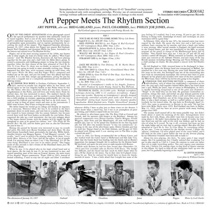 Art Pepper 的經典專輯《Meets The Rhythm Section》作為 Contemporary Records 成立70週年紀念系列的一部分,於 Acoustic Sounds Series 中華麗重現。這張錄於1957年的專輯,堪稱他音樂生涯的重要轉捩點。當時 Pepper 受邀與 Miles Davis 五重奏的東岸節奏組合作——鋼琴的 Red Garland、低音提琴的 Paul Chambers,以及鼓手 Philly Joe Jones。這樣的組合本身已是話題,更別提在毫無預警、沒有排練的狀況下,他便進入錄音室完成了這場驚人的即興演出。
