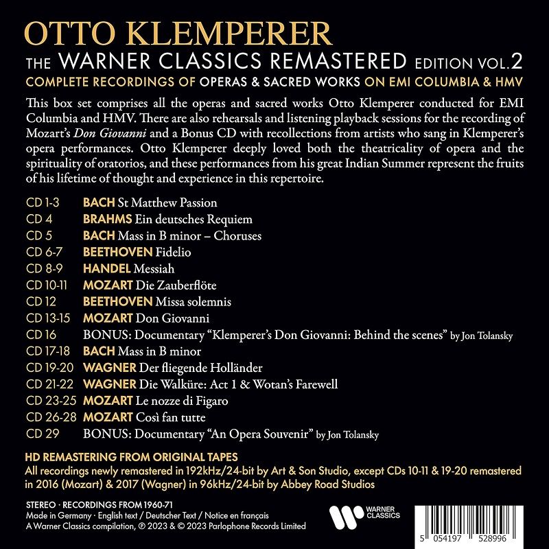 此套裝中的錄音均由Art&Son Studio使用原始母帶,以192kHz/24-bit數位技術重製,除了CD10-11以及CD19-20的《魔笛》是2016年就已使用192kHz/24-bit數位技術重製,和2017年的《漂泊的荷蘭人》是當時已在艾比路錄音室為這些傳奇的性的歌劇專輯已數位重製過。