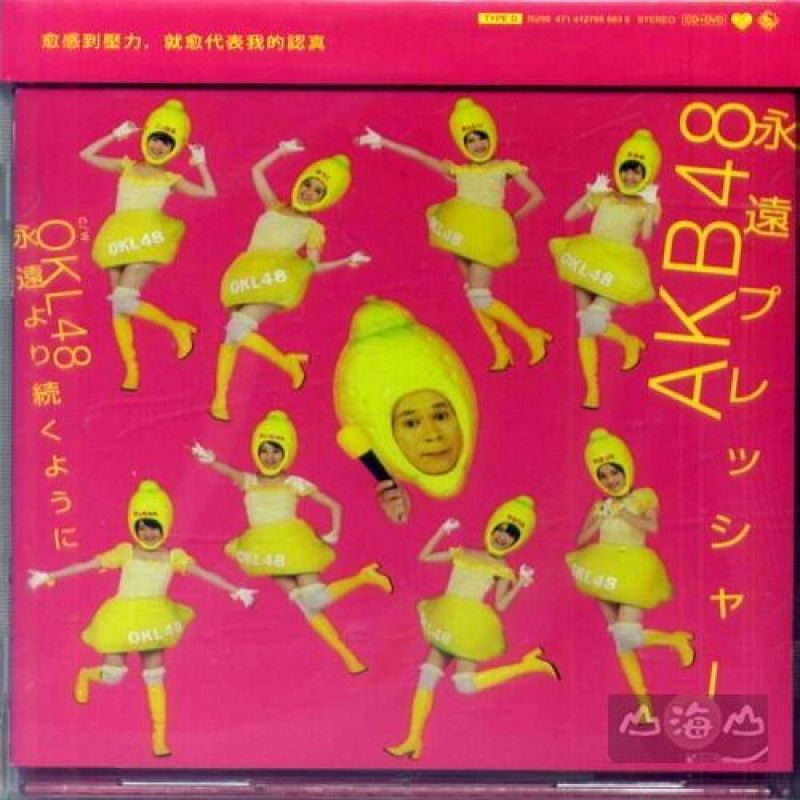 創下史上10張百萬單曲 首席女子天團AKB48、全新體制進化登場! ★愈感到壓力、就愈感到我的認真★ 今年9月19日再度於東京.日本武道館舉行「AKB48 29th Single選拔猜拳大賽」中,由所屬Team B、被歌迷暱稱為”PARURU”的島崎遙香一路過關斬將贏得第三屆的拳王冠軍寶座!由最後出線的16名成員阿部瑪莉亞、板野友美、上野圭澄、內田真由美、梅田彩佳、柏木由紀、木本花音、篠田麻里子、竹內美宥、中田千里、中村麻里子、仁藤萌乃、前田亞美、松原夏海及橫山由依領軍演唱全新單曲《永遠的壓力》。 輕快可愛氛圍的同名主打曲〈永遠的壓力〉描寫出女孩子缺乏自信的心情,堪稱是一首正統偶像流行曲! 共通附錄曲為搭配日本7-ELEVEN耶誕季主題曲〈最特別的耶誕節〉。 『Type-D』獨家收錄曲&封面,將於12月1日於日本電視節目 「めちゃ2イケてるッ!」發表內容! 日本短版MV精彩試看中!http://jpopmomomo.blog100.fc2.com/blog-entry-7203.html ★DVD(3區)內容★ ‧〈永遠的壓力〉〈最特別的耶誕節〉2支共通曲MV。 ‧12月1日於日本電視節目 「めちゃ2イケてるッ!」發表內容! ★初回限定特典★ 內附台壓盤Type_D獨家授權生寫真一張