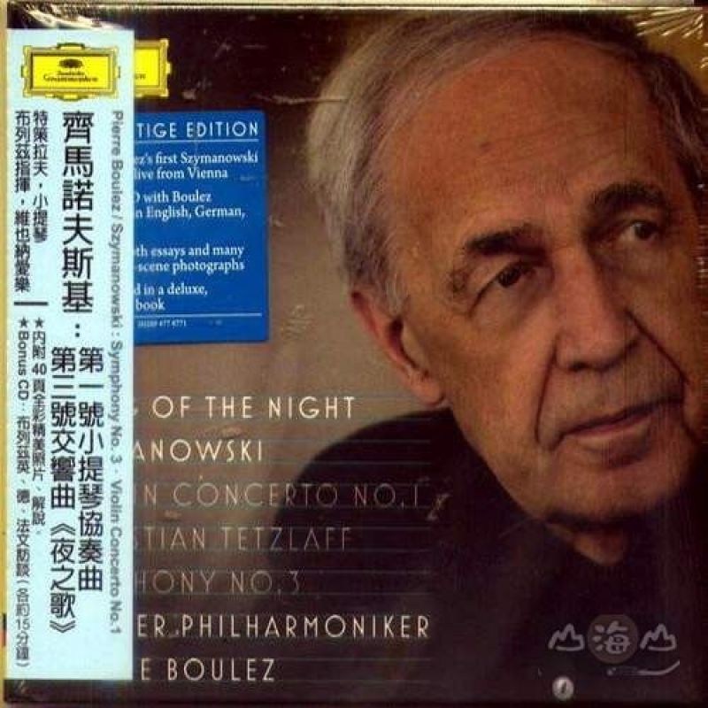 特策拉夫,小提琴/布列茲 (指揮) 維也納愛樂 內附40頁全彩精美照片、解說。 加贈Bonus CD:布列茲英、德、法文訪談 (各約15分鐘+) 布列茲的唱片數量極大,曲目也相當廣泛,不過,這是他第一次錄製齊馬諾夫斯基這位波蘭印象派作曲大師的作品,為2009年六月(協奏曲)與2010年三月(交響曲)與維也納愛樂在維也納金色大廳的音樂會實況錄音,由德國小提琴家特策拉夫擔任獨奏。 布列茲首度接觸到齊馬諾夫斯基的作品是在1942年。當時先鋒派的音樂並不受歡迎,因此到處都能聽到理查‧史特勞斯的作品,但是史特拉溫斯基、巴爾托克,甚至是第二維也納樂派的作品演出機會就非常少。但是布列茲聽了小提琴家提博在獨奏會上演奏齊馬諾夫斯基的作品後,留下至今仍然非常難忘的印象。 齊馬諾夫斯基早年就對伊斯蘭文化極感興趣,特別是蘇非派禁欲神秘主義,附有合唱聲樂的第三號交響曲《夜之歌》無疑受到這個興趣的影響很大。歌詞取材自十三世紀波斯詩人魯米的作品。詩裡提到中東地區夜晚的美麗與清澄的天空,魯米吩咐朋友不要睡覺,仔細注視這美麗與寂靜的夜晚。齊馬諾夫斯基的音樂並不著重於樂曲的結構與發展,而是追求自由與永恆的流動感,頗有史克里亞賓之風。 完成於1916年的第一號小提琴協奏曲,是齊馬諾夫斯基為波蘭小提琴家科哈尼斯基創作的作品。發展出自己的風格以前,齊馬諾夫斯基努力的從華格納、理查‧史特勞斯、史特拉溫斯基……等前輩身上吸收養份,並且把這些養份變成自己的血肉。作品完成後,齊馬諾夫斯基曾經很高興的表示,這部作品「充滿了前所未有的想像力」。後世評論者也同意齊馬諾夫斯基的說法。 除了音樂錄音,這一套豪華的專輯還附有布列茲的法語、德語與英語專訪錄音,兩篇文章以及多張錄音時的精美照片。