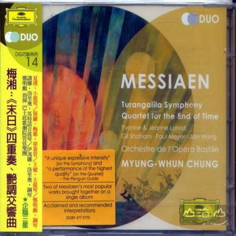 ⊙夏漢,小提琴/保羅‧梅耶,單簧管/王健,大提琴/鄭明勳,鋼琴 ⊙讓娜‧洛里奧,馬特諾音波琴/伊馮娜‧洛里奧,鋼琴/鄭明勳指揮巴士底歌劇院管弦樂團 為鋼琴獨奏、馬特諾音波琴與管弦樂團所寫的《艷調交響曲》梅湘1945年的作品,為波士頓交響樂團與庫塞維茨基委託創作之作。「Turangalila」 這個字來自梵語,同時含有情歌、讚頌歡樂、時間、節奏、生死等多種意思。梅湘把它當成作品的標題,是想以這個字的多層意思來幫助愛樂者了解音樂內涵。全曲 共分十個樂章,但是可以分成四個主題,分別是雕像、 花、愛情,以及沒有具體標題,只是梅湘為了實現音色、節奏與音域變化而設計的簡單和聲。 《末日》四重奏是第二次世界大戰期間,梅湘被囚禁在德軍戰俘營時期的作品。如同標題所示,梅湘的構思來自宗教預言的寓意。梅湘在樂譜封面寫著「獻給世界末 日的天使,他把手伸向天空並且宣告:『時間將不復存在』」 鄭明勳在1990年錄製的《艷調交響曲》時,梅湘曾經親臨錄音室,而兩位獨奏家,正是梅湘的妻子與小姨子。鄭明勳的詮釋具有獨特的風格與激情,而伊馮娜‧ 洛里奧的鋼琴獨奏為整體效果增色不少。1999年錄製的《末日》四重奏水準極高,四名獨奏家從頭至尾都能以全神貫注的音樂張力,緊緊抓住愛樂者的注意力。