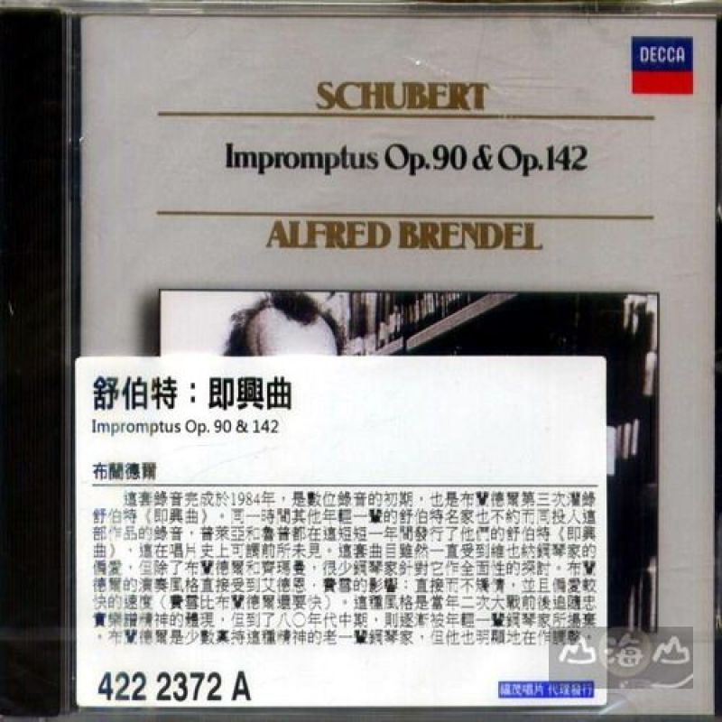 八首即興曲 Impromptus Op. 90 & 142 布蘭德爾 Alfred Brendel 這套錄音完成於1984年,是數位錄音的初期,也是布蘭德爾第三次灌錄舒伯特《即興曲》。同一時間其他年輕一輩的舒伯特名家也不約而同投入這部作品的錄音,普萊亞和魯普都在這短短一年間發行了他們的舒伯特《即興曲》,這在唱片史上可謂前所未見。這套曲目雖然一直受到維也納鋼琴家的偏愛,但除了布蘭德爾和齊瑪曼,很少鋼琴家針對它作全面性的探討。 早期僅有許納貝爾和艾德恩.費雪完整灌錄《即興曲》,一般德奧鋼琴家多半認為這部作品不適合完整呈現,因此錄音空缺大都由女性鋼琴家予以填補,像是莉莉克勞絲和海布勒,而肯普夫則到六○年代才將這套樂曲加入演奏曲目。 布蘭德爾的演奏風格直接受到艾德恩.費雪的影響:直接而不矯情,並且偏愛較快的速度(費雪比布蘭德爾還要快)。這種風格是當年二次大戰前後追隨忠實樂譜精神的體現,但到了八○年代中期,則逐漸被年輕一輩鋼琴家所揚棄。布蘭德爾是少數稟持這種精神的老一輩鋼琴家,但他也明顯地在作調整。這是因為世人對舒伯特作曲家的身份、及《即興曲》的定位在八○年代有了顯著而積極的改變。包括霍洛維茲等大鋼琴家都在這個時期將這套樂曲納入彈奏清單,布蘭德爾則以先知的身份再度灌錄,正是有意告訴世人:他是最早獨排眾議,並賦予《即興曲》正面意義的鋼琴家。