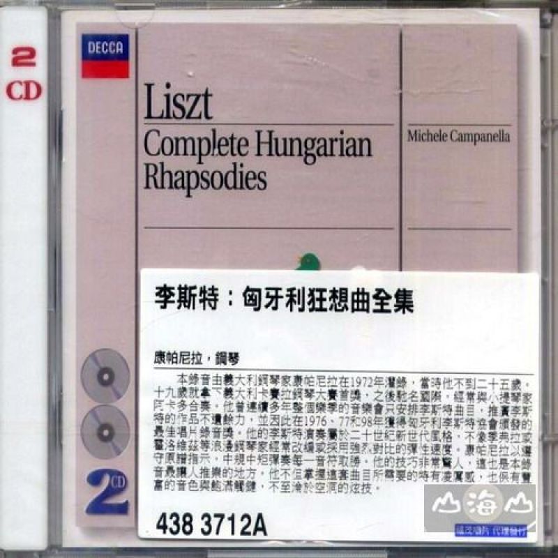 李斯特:匈牙利狂想曲全集 Liszt: Complete Hungarian Rhapsodies 康帕尼拉,鋼琴 Campanella, piano 本錄音由義大利鋼琴家康帕尼拉在1972年灌錄,當時他不到二十五歲。十九歲就拿下義大利卡賽拉鋼琴大賽首獎,之後馳名國際,經常與小提琴家阿卡多合奏。灌錄過貝多芬鋼琴奏鳴曲全集與莫札特鋼琴協奏曲全集,但最聞名的就屬李斯特詮釋。他曾連續多年整個樂季的音樂會只安排李斯特曲目,推廣李斯特的作品不遺餘力,並因此在1976、77和98年獲得匈牙利李斯特協會頒發的最佳唱片錄音獎。 他的李斯特演奏屬於二十世紀新世代風格,不像季弗拉或霍洛維茲等浪漫鋼琴家經常改編或採用強烈對比的彈性速度。康帕尼拉以遵守原譜指示,中規中矩彈奏每一音符取勝。他的技巧非常驚人,這也是本錄音最讓人推崇的地方。他不但掌握這套曲目所需要的特有凌厲感,也保有豐富的音色與飽滿觸鍵,不至淪於空洞的炫技。且他掌握了曲中李斯特所要呈現的幽默滑稽特質,讓樂曲聽來總讓人有一種小丑逗趣的熱鬧感。