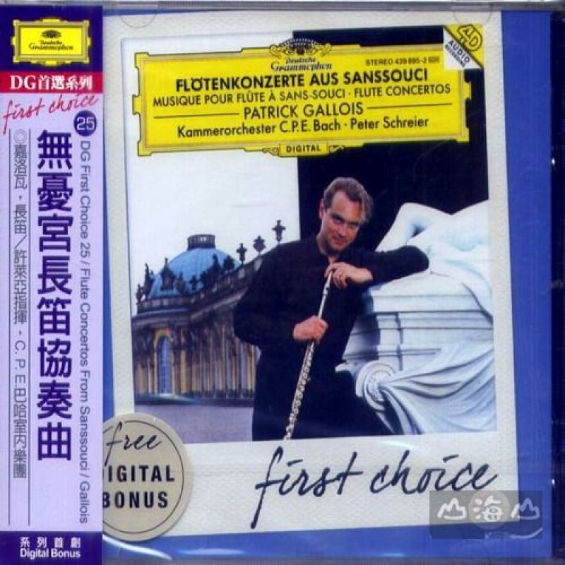 ☉嘉洛瓦,長笛╱許萊亞指揮,C. P. E.巴哈室內樂團 「Sanssouci」指的是普魯士王腓特烈大帝位在波茨坦的宮殿,一稱「無憂宮」。腓特烈大帝是著名的音樂愛好者、支持者,也是業餘的長笛音樂家。當時著名的C. P. E.巴哈、鄺茨等音樂家都在他宮內任職,音樂之風甚盛。本唱片不但搜集當時這批無憂宮代表作曲家寫作的長笛協奏曲,還收錄一首腓特烈大帝本人的作品。愛樂者不妨聽聽「帝王之聲」與升斗小民有何不同。 獨奏家嘉洛瓦1956年出生在法國南部,十七歲進入巴黎音樂院師從朗帕爾,兩年後以第一名優異成績畢業。畢業後的嘉洛瓦在里爾愛樂管弦樂團擔任長笛首席,二十一歲應聘擔任法國國家管弦樂團長笛首席與獨奏家。1984年開始以獨奏家身份進軍國際樂壇。他的樂句演奏語法流暢,特別艱難的技巧在他演奏中顯得平易近人。