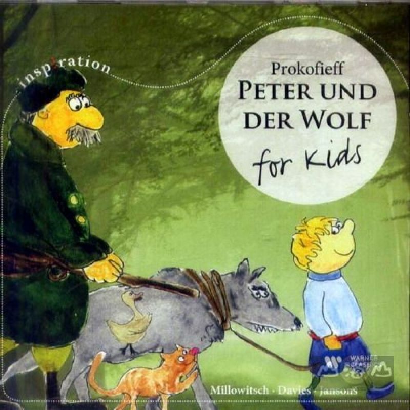 ★靈感時刻:親子共同聆賞的時光 「彼得與狼」是音樂史上少數真正為小朋友創作的古典音樂。俄國作曲家普羅高菲夫在一九三六年於俄國發表這套作品,故事也是由他所創作的,原來發表時就是要用管弦樂團演奏再加上旁白,來描述故事的進行。這是由當時蘇聯的中央兒童劇場委託普羅高菲夫創作的兒童交響曲,希望藉此能培養學齡兒童對音樂的品味,普羅高菲夫對這樣的題材很感興趣,連故事發想到劇本和創作配樂,前後只花了四天的時間,卻成為他畢生最常為人演出和聆聽的作品,雖然如此,此劇在一九三六年五月二日於莫斯科的首演卻非常不受到好評。此劇描寫小男孩彼得住在爺爺家,這是一處森林裡的空地。有天彼得到森林玩,忘了關上大門,家裡的鴨子因此跑出去池塘玩水,在這裡遇到一隻小鳥,兩人吵起來,彼得的貓也跟在後面,虎視眈眈,還好彼得趕到提醒小鳥飛走,鴨子也游進池塘。彼得爺爺回家後罵他不該到草地玩,因為會有狼。彼得卻回嘴說自己不怕狼。之後果然有大灰狼來,貓咪爬上了樹,鴨子卻被野狼吃掉。彼得躲在花園牆上,要小鳥幫他引開野狼的注意,他則趁機用繩子套住野狼尾巴,把狼綁在樹上。獵人見狀想射殺野狼,但彼得說服大家把狼送到動物園,一群人浩浩蕩蕩連同小鳥、彼得、獵人和老爺爺於是一起上路,前往動物園。旁白最後還提醒,注意聽,因為野狼一時情急,把鴨子活吞了下去,所以即使被吞下肚,鴨子還在呱呱叫。這份錄音是由美國指揮家戴維斯在一九九二年於德國波昂灌錄的。旁白者米洛維奇是以德文念這段故事,他在德國是非常知名的老演員,念故事時已經八十一高齡了,後來他就在八年後以九十歲過世。他是德國的戲劇世家出身,從十八世紀末家人就投入劇場界,他擁有德國著名的米洛維奇劇場,這是從一七九二年就創建有兩百年歷史的米洛維奇家庭劇場,到過科隆市的人都一定要參觀的古蹟和德國人文勝地。