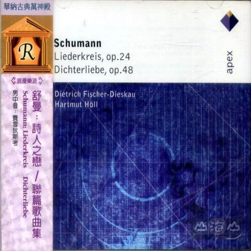 浪漫樂派 男中音:費雪狄斯考(Fischer-Dieskau) 正與舒曼本身的精神疾病有某種程度的相似性,而或許也正因如此,這闕完成於一八四零年,他娶下克拉拉威克前的藝術歌曲,才能那麼成功地捕捉到原詩那種陷於熱戀中時而天堂時而地獄的多變情緒,這份錄音是偉大的德國男中音費雪狄斯考生平最後一次灌錄這套聯篇歌集的紀錄,他的詮釋隨著年歲而改變,在多年未灌錄此作後,格外的具有啟示性。